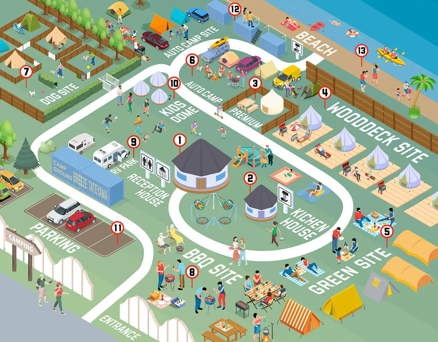 - ①RECEPTION HOUSE(管理棟、トイレ、シャワー)